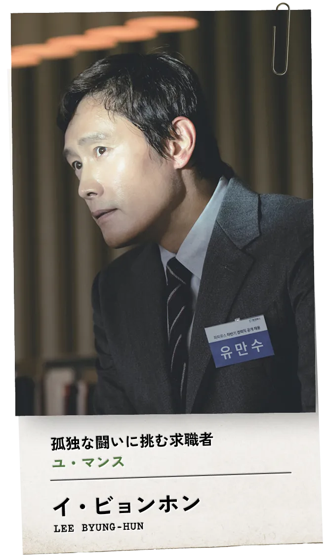 マンス役のイ・ビョンホンは、『JSA』と『美しい夜、残酷な朝』に続き、本作でパク・チャヌク監督と再びタッグを組み、さらに深く細部にわたって息を合わせた。限界を知らない縦横無尽な役作りで、孤軍奮闘する求職者マンスを演じ、これまで見たことのない顔を完成させた。「極端な状況をどうすれば説得力を持って見せられるか。その点に最もこだわって演じようと努めた」と語るイ・ビョンホンは、マンスの複雑な内面を繊細に表現し、観客を映画の中へと引き込む。