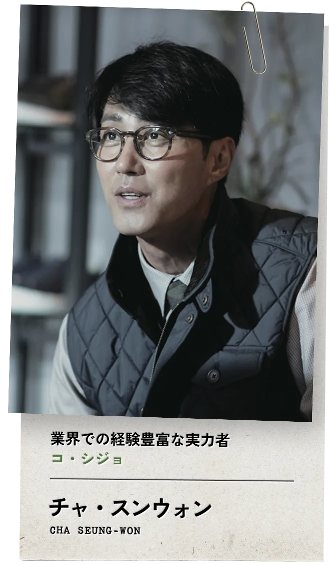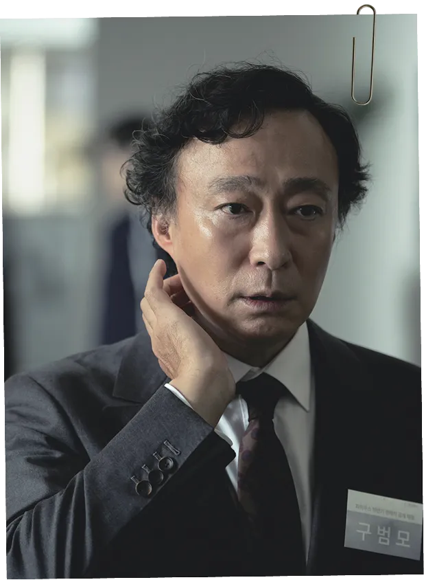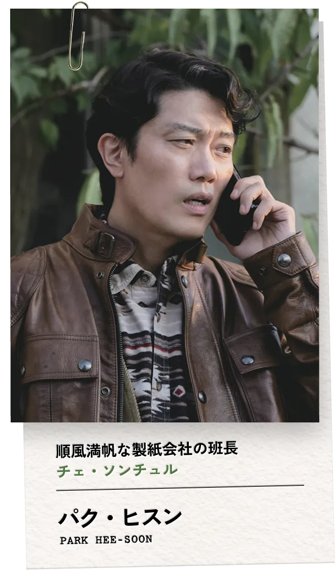 『警官の血』、「コンフィデンスマン KR」など、スクリーンと配信ドラマを股にかけて活躍してきたパク・ヒスンは、順風満帆な製紙会社の班長ソンチュルに扮した。「ソンチュルは様々な葛藤を抱えた人物であり、うまくバランスを取ることがカギだった」と、役作りへの努力を語るパク・ヒスンは、渋い魅力が際立つ印象的な演技を披露している。