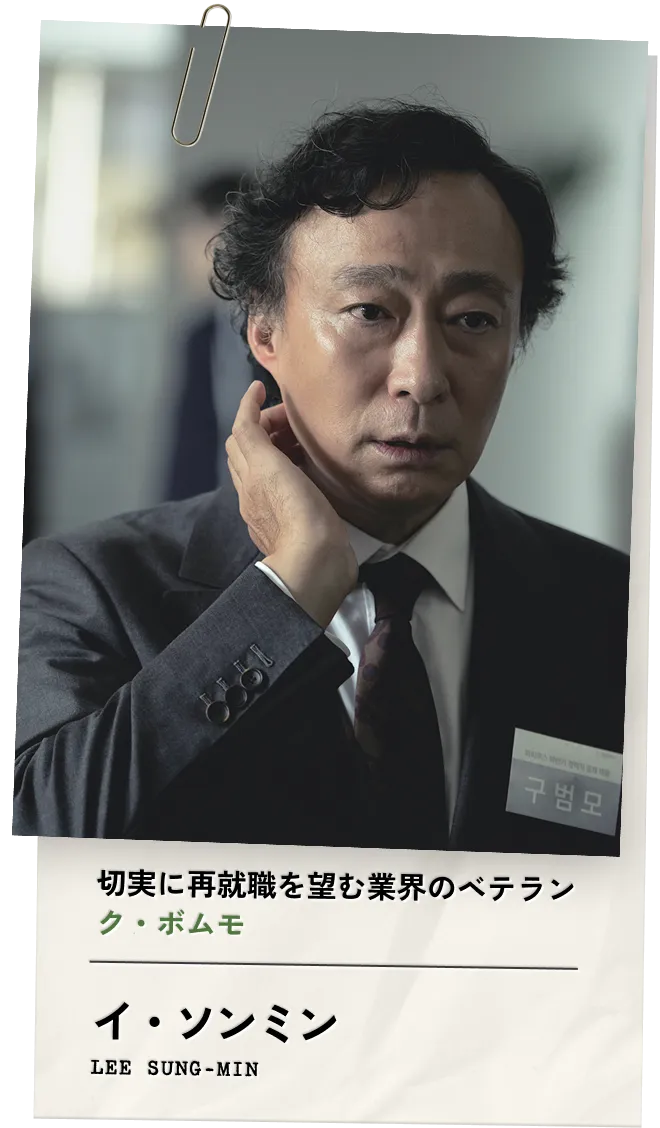 黒金星(ブラック・ヴィーナス)と呼ばれた男』など、どの作品においても誰もが信頼を寄せる演技力を誇るイ・ソンミンは、切実な思いで再就職を目指す製紙業界のベテランのボムモを演じた。「ボムモはアナログで平凡な人物だ。ボムモをパク・チャヌク監督の視点で表現するために、常にいくつかのケースを想定して役作りをした」と語っていることから、ディテールにこだわってボムモを完成させたことがうかがい知れる。