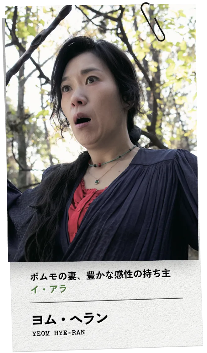 繊細で感受性豊かなボムモの妻アラを演じたのは、「マスクガール」、「おつかれさま」で2年連続、百想〔ペクサン〕芸術大賞助演女優賞を受賞したヨム・ヘラン。出演作ごとに驚くべき変身を遂げてきたヨム・ヘランは、「アラは、これまで一度も演じたことのない新しいキャラクター」と語り、本作での演技に期待が膨らむ。